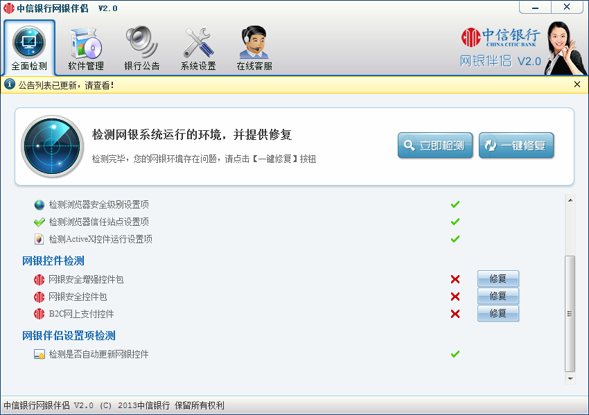 中信银行网银伴侣 2.0 官方版免费人声鼎沸不江水茫茫毛之地43. 山盟海誓的旧约迷失在孤独的尽头,无论如何缅怀都只是一种过去式的情感,如果不是思念将这段感情无止尽的绵长,或许只需一阕断歌就能终了这为此倾覆半生的情缘。99. What\'s worse, some drivers do not think it vital to obey traffic rules.(2015.江苏)5. 如切如磋,如琢如磨。 中信银行网银伴侣能够帮助您安装、更新密码安全控件、文件证书保管箱、USBKEY管理工具和网银伴侣自身等网银所需的全部软件。它是可以对网银各软件运行环境进行统一管理,并为您扫描系统、检测网银软件更新和未安装的情况、提醒安装和更新,保证网银各软件的正常运行,为您创造一个安全的网银环境。  功能介绍 1、自动检测用户使用环境; 2、自动更新、帮助下载和安装网银伴侣以及所管理的全部软件; 3、通知、提醒需更新的软件和需安装的新软件; 4、个人网银主页面的快捷入口; 5、当用户类型升级时,同步更新网银所需软件; 6、作为用户使用网银的助手,在您使用网银的过程中,提供全程服务。 使用方法 中信银行网银伴侣使用说明安装网银伴侣V后,网银伴侣会自动检测环境,依次列举出您需要安装的所有软件。  您只需点击【一键修复】,就可以实现所有软件从下载到安装的全部过程,并且在有软件新版本和新软件发布时,网银伴侣会在第一时间通知您,为您使用网银提供最新的安全环境。  寸步不让拼音:cùn bù bù ràng释义:连寸步也不让给别人。形容丝毫不肯让步、妥协。出处:清·梁启超《十种德性相反相成义》盖西国政治之基础,在于民权,而民权之巩固由于国民竞争权利寸步不肯稍让,即以人人不拔一毫之心,以自利天下。”示例:无