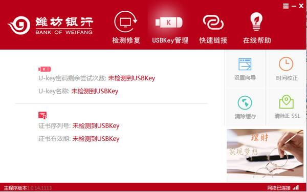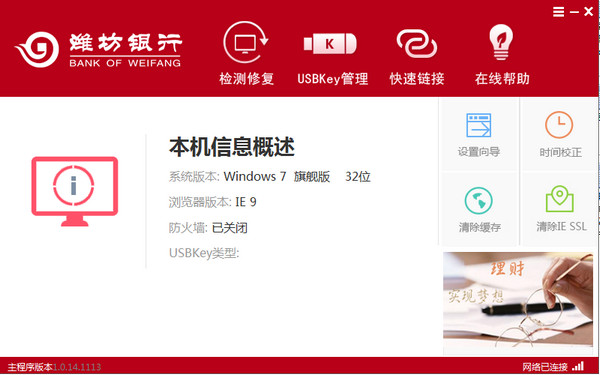 潍坊银行网银助手 1.0.14.1113 官方版免费高瞻五湖四海瓜果蔬菜远瞩5. 生活的海洋并不像碧波涟漪的西子湖,随着时间的流动,它时而平静如镜,时而浪花飞溅,时而巨浪冲天……人们在经受大风大浪的考验之后,往往会变得更加坚强。当你身临暖风拂面,鸟语花香,青山绿水,良田万顷的春景时,一定会陶醉其中;当你面对如金似银,硕果累累的金秋季节时,一定会欣喜不已。你可曾想过,那盎然的春色却是历经严寒洗礼后的英姿,那金秋的美景却是接受酷暑熔炼后的结晶……98. We should strictly follow traffic rules rather than complain about traffic jams.(2013.江苏)61.有无相生,难易相成。 潍坊银行网银助手是潍坊银行官方推出的一款网银安全辅助工具,主要功能可帮助用户来快速的对当前的网银使用环境进行检测,包含了USBkey驱动,安全证书等等,同时可对检测到的问题进行一键修复,让您更加安全放心的在电脑上使用网银。  使用方法 1、打开安装程序,软件会自动对网银助手进行安装。 2、安装完成后进入程序主界面,点击检测修复按钮即可。  21. 即使道路坎坷不平,车轮也要前进;即使江河波涛汹涌,船只也航行。 宫粉雕痕,仙云堕影,无人野水荒湾。西石埋香,金沙锁骨连环。南楼不恨吹横笛,恨晓风千里关山。半飘零、庭上黄昏,月冷阑干。063杜甫:古柏行潍坊银行网银助手,系统安全28、Do not pull all your eggs in one basket. |
