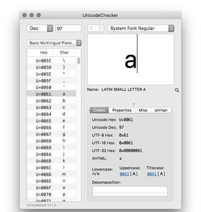 UnicodeChecker Mac版 版本:V1.21.1免费龙争虎斗孤云野鹤久旱逢甘露3. 他们用自己的所有精力和人生去实现他们追求的。他们用自己的亲身经历告诉我们能够将一件事做好,其实已经实现了自己的价值。而我们现在所应该做的,就是做好一件小事,在小事中认真,才能去完成那些关乎一生的大事。have a brief understanding of:对......有简单的了解237.烟笼寒水月笼沙,夜泊秦淮近酒家。商女不知亡国恨,隔江犹唱《后庭花》。《泊秦淮》 UnicodeChecker Mac版是Mac平台上的一款开发软件。UnicodeChecker Mac版可以显示Unicode标准中的每个代码点的信息。对于给定的数字,UnicodeChecker将显示该字符及其UTF-8、UTF-16和UTF-32编码、XHTML实体、Unicode名称、映射信息等等。  软件特色 UnicodeChecker Mac版包含了特性数转换功能和其他Unicode实用工具,其中一些也添加到OS X“服务”菜单或AppleScript(例如,将文本转换为HTML字符实体,Unicode CSS或Java,得到属性通过AppleScript)这样他们可以在其他应用程序中使用。  软件截图2