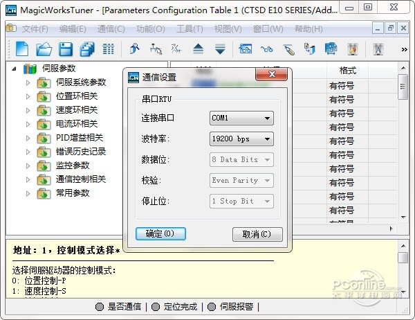 使用说明 通信设置: 在MagicTuner的主界面选择菜单连接->通信设置,或者点击工具条上的通信设置按钮,即可打开通信设置对话框,界面如下图,在该对话框中,您可以对接口参数进行修改。 可以设置下列站参数和网络参数: 连接串口:在编程设备上或PC上选择要连接通信电缆的接口(COM串行接口)。 波特率:选择要在网络中使用的传输速率。 数据位:选择数据传输格式的数据位。 校验:选择数据传输格式的奇偶校验。 停止位:选择数据传输格式的停止位。 注意:只有在单击"确定"关闭该对话框后,所作的修改才能生效。