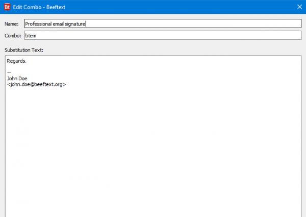 Beeftext(开源文本替换工具) 6.0官方版免费刀山火海一叶扁掩耳盗铃舟14. 心不够宽,所以不快乐。心宽,不是强忍伤痛,捏着鼻子吃屁,那叫委曲求全。真正的心宽,是境界的超越,是不与其一般见识的豁达与超脱。我们中的有些人总是理所当然地认为,父母或者祖父母应该照顾我们。371.长江后浪推前浪,一代新人换旧人。 Beeftext是一款开源文本替换工具,软件可以记录用户经常键入的文本,以便大家可以使用简单的热键将它们插入任何位置。有需要的用户可以下载使用。  功能介绍 Beeftext让你的打字生活更轻松 Beeftext是为你做的。Beeftext允许您定义组合。组合键将在正常情况下不太可能键入的短单词(关键字)与通常需要键入的长文本或复杂文本(片段)相关联。从现在起,每次在任何支持复制/粘贴的应用程序的任何文本区域中键入关键字(99.9%)时,都会触发组合框,Beeftext会自动用其关联的片段替换关键字。由于Unic ode编码,此文本可以是任何语言,使用任何类型的字符,甚至是外来字符。 Beeftext是开源的 文本替换工具不是新的。因为在Windows平台上,现有的解决方案要么是昂贵的,要么是关闭的源代码,要么是不维护的,要么是复杂的设置,要么是任何的组合。Beeftext是免费的-就像免费啤酒一样-不包含广告和恶意软件。 您可以验证,因为Beeftext是开源的。应用程序的源代码、安装程序甚至这个web页面都托管在GitHub上。 Beeftext尊重您的隐私 为了执行它的工作并能在任何地方工作,Beeft56. 我希望我跟你的名字能写在一起,不管是在婚礼的喜帖上,还是在葬礼的墓碑上。ext“监听”你的按键。只要程序运行,Beeftext就会收到每个键盘(和鼠标)交互的通知。但是Beeftext不存储任何与输入相关的信息,而且绝对不会因为任何原因将数据发送到任何服务器。Beeftext执行的唯一网络活动是每天从Beeftext网站下载一个文本文件,以检查是否有更新版本的应用程序可用。此功能可以在应用程序首选项中禁用。 使用方法 一、创建组合。 组合框是与替换文本关联的文本快捷方式。  软件截图2 二、在任何应用程序中执行组合。 Beeftext适用于任何支持复制/粘贴的应用程序。  软件截图3