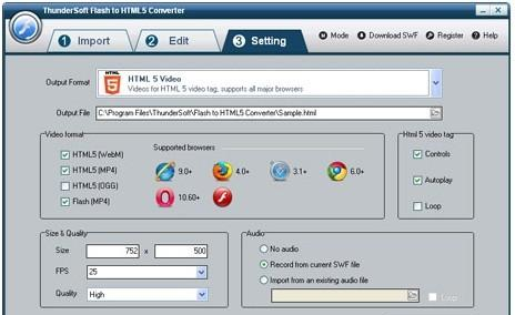 ThunderSoft Flash to HTML5是一款功能强大的flash转html5工具,直接导入flash视频即可,软件输出支持所有主要的网络浏览器:IE,Firefox,Apple Safari,Chrome,Opera,并且可以在ipad,iPhone中查看。  功能介绍 将SWF转换为视频格式AVI,MPEG,MOV,MKV,WMV,FLV,MP4 将SWF转换为HTML5视频,支持所有主流浏览器,并且可以在iPad,iPhone上查看。 将SWF转换为GIF动画格式 ThunderSoft Flash to HTML5官方版支持图像徽标或水印 允许批量转换 允许从Internet下载swf文件 允许裁剪Flash电影以进行输出 输出格式的配置文件设置以设置视频和音频参数 支持自动转换和用户交互转换过程 音频捕获技术100%保持原始音效 准确的音频和视频同步 使用方法 第1步-导入swf文件。1. 每个孩子都有梦想,我的梦想是当一名画家,画出各种颜色的苹果,让世界更绚烂! 在“导入”页面上,单击浏览器按钮以添加swf文件。您可以获取有关此文件的闪存信息,并在转换之前进行预览。  软件截图2 第2步-编辑Flash影片(可选) 在“编辑”页面上,可以裁剪Flash电影并将水印,徽标,版权图像添加到创建的视频上,以将其标记为您自己的视频。如果您不想编辑视频,只需将其跳过到“设置”页面即可。  软件截图3 第3步-设置html5视频格式和目标位置 在“设置”页面上,根据需要选择适当的html5视频格式。不同的html5视频格式支持不同的Web浏览器。配置html5视频标记设置,例如控制栏,自动播放和循环。您也可以从swf文件或其他音频文件中选择音频。  软件截图4 第4步-开始转换 完成所有设置后,单击“转换”按钮,“捕获”窗口将显示如下,选择一种模式:“自动”或“手动”。手动模式对于交互式SWF文件很有用,否则您可以选择自动模式。单击“播放和捕获”按钮开始。在转换过程中,可以将程序最小化到系统托盘。  软件截图5 西园夜饮鸣笳。有华灯碍月,飞盖妨花。兰苑未空,行人渐老,重来是事堪喈。烟暝酒旗斜,但倚楼极目,时见栖鸦。无奈归心,暗随流水到天涯。150刘禹锡:蜀先主庙ThunderSoft,Flash,to,HTML5(flash转html5工具),ThunderSoft,Flash,to,HTML5(flash转html5工具)下载,视频转换,影音工具What the arguer fails to understand (consider /mention) is that… |