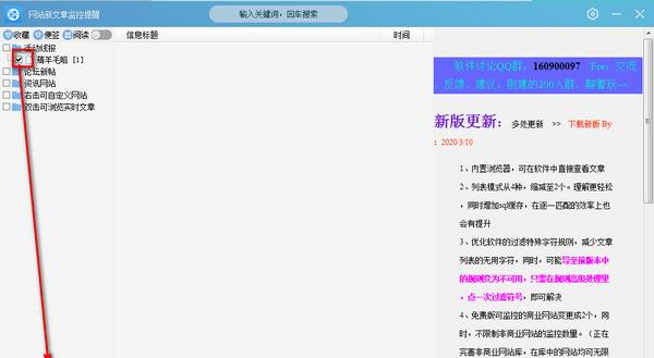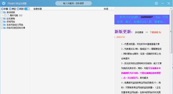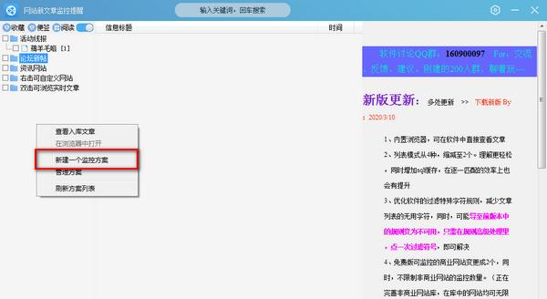 网站新文章监控提醒 2.52 绿色版免费春仰不愧天拥挤不堪光明媚心是一棵树,一个个故事被年轮携载;一回回驿动与飞鸟相约;一次次碰撞使它绵密柔韧;一幕幕经历造就了它博大的胸怀。spare no effort to do sth 不遗余力地做某事;acquire knowledge 获取知识;discouraged泄气的;失去信心的184.此曲只应天上有,人间能得几回闻。《赠花卿》 网站新文章监控是一款非常好用的论坛、网站新文章监控软件,利用网站新文章监控用户能够实时捕捉到网站或者论坛最新的发文并且支持使用软件进行预览,非常适合网赚、编辑、投资者使用,有需要的可以下载使用。  基本简介 网站新文章监控提醒是一款可以监控多个网站(支持自定义)的新文章的软件,实时抓取新的文章。同时支持对设定的关键词进行分级提醒,根据预设的预警条件进行电脑弹窗提醒、响铃、提醒到微信等多种提醒方式 功能介绍 1、监控网站新文章:软件周期性的自动监控多个网站,发现新文章时,会自动加入到数据库,并提醒有新文章 2、一键提取多个网站文章:上网习惯性看网站资讯、论坛、贴吧等网站,软件可一键提取这些网站的新文章,减少网站一个个打开的等待时间,提高工作效率 软件特色 灵活性高,可自由制定网站规则,可对大多数网站进行文章提取与监控。体积轻巧,压缩包仅800kb,代码精练,执行效率高,工作时系统资源占用小,不卡等 适用人群与使用场景: 1、网赚一族:监控多个有奖活动的网站(活动线报),一旦发现有新活动,软件自动获取并提醒参与,第一时间获取各大撸羊毛信息。让你撸到嗨,告别手慢无~~ 2、小编:一键读取已设定的所有网站的新文章信息,不用一天来回开网页手动,看到合适的,直接转载,福音啊! 3、爱逛网站或论坛的同学:上班时不时的想去看看自己喜欢的网站有没有新文章,也是一种强迫症,用软件一键读取,省的还省力~ 4、需要采集网页上的信息:一个页面中有100张图片,可用软件一键将100张图片地址获取出来5、投标单位:可使用软件监控政府的投标网站,一旦发现有新的招标,可第一时间通知到电脑与手机 6、企业:第一时间从微博、论坛、新闻中监控全网负面消息,最好用的舆情监控利器 7、投资者:可监控某一行业的动态,第一时间收到新的动态,了解市场行情。 8、信息爱好者:全自动抓取自己关注的网站或论坛的新信息,聚合后,发到手机微信或邮箱等 功能介绍 1、右侧为文章列表框,显示文章列表 2、左侧为方案列表区,双击某方案,右侧文章列表框中会显示该方案的文章 3、当查看某方案的文章时,若想查看所有方案的文章列表,可单击左上方的“全部文章”按钮,即可查看所有的文章 4、右击某方案,可弹出快捷菜单 5、右击文章列表框,可弹出操作菜单,可收藏的文章 6、单击左上方的“收藏夹”按钮,即可查看已经收藏的文章 7、左下角的存亡绝续拼音:cún wáng jué xù释义:绝完结;续延续。事物处在生存或灭亡、断绝或延续的关键时刻。形容局势万分危急。出处:《晚清文学丛钞·新中国未来记》第一回这六十年中,算是中国存亡绝续的大关头。”示例:无“监控勾选”按钮作用:单击后,软件将自动循环监控方案框中被勾选的方案的文章(图中监控频率为300,可自定义)。同时该按钮上的文章将变成“停止监控”。 8、左下角“一键提取”作用:点击后,软件将提取所有方案的文章,每点击一次则只会执行一轮。一轮提取结束后,该任务会停止。 使用方法 一、下载打开软件,右键点击创建一个新的方案。  软件截图2 二、进入方案操作界面,按照右下角的提示填写要监控的网址的信息。  软件截图3 三、输入完后勾选网站,点击开始监控,软件就会对网站进行实时监控。  软件截图4 更新日志 版本更新 v2.5(测试版)By:2020/3/10 1、内置浏览器,可在软件中直接查看文章 2、列表模式从4种,缩减至2个。理解更轻松,同时增加sql缓存,在逐一匹配的效率上也会有提升 3、优化软件的过滤特殊字符规则,减少文章列表的无用字符,同时,可能导至前版本中的规则变为不可用,只需在规则高级处理里,点一次过滤符号,即可解决 4、免费版可监控的商业网站变更成2个,同时,不限制非商业网站的监控数量。(正在完善非商业网站库,在库中的网站均可无限量监控) 5、新增json模式,如果设置页面为json页,软件将自动为其解码变成中文 6、数据库文件kaka.sdb变更为.db,使数据库兼容更多软件查看,及网页语言(php/java)等直接调用,同时,数据库结构有变动,不能从老版本直接升级,需要将老版规则导出,再导入到新版本数据库完成软件升级。 7、右击文章列表,可直接一键导出选择行的文章信息到剪切板 8、软件细节优化,本版为内测版本,核心功能有变动,可能存在未知的问题 木兰花 刘克庄318李白:清平调三首之二网站新文章监控提醒,网站新文章监控提醒下载,网络监测,网络工具We don’t have to look very far to see (find out) the truth (validity) of this argument (proposition). |