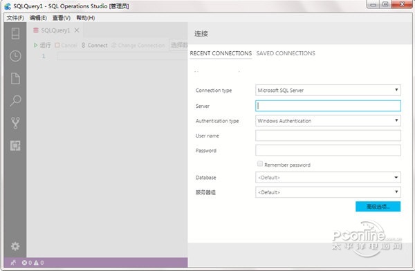 使用说明 启动SQL Operations Studio (preview)。 首次运行SQL Operations Studio绿色版 连接对话框随即打开。 如果连接对话框不会打开,请单击新连接图标服务器页: 新建连接 本文章将使用SQL 登录名,但Windows 身份验证支持。 如下所示填写字段: 服务器名称: localhost 身份验证类型: SQL 登录名 用户名: SQL Server 的用户名称 密码: SQL 服务器密码 数据库名称: 将此字段留空 服务器组: <默认> 新的连接屏幕 创建数据库  SQL Operations Studio