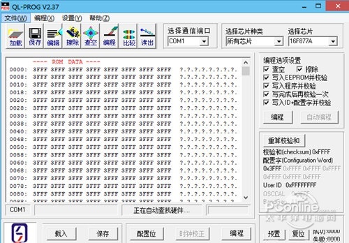 使用方法 在连接好硬件并给硬件上电,软件启动好以后,如果提示"硬件没有连接,请重新复位硬件"则一般情况是硬件的端口没有选择正确或者编程器型号没有选择正确,我们为用户提供两种选择硬件端口与编程器型号的方法 方法一:直接执行"设置"菜单下的"自动查找硬件",软件会自动扫描硬件连接在哪一个端口,并检测编程器的型号,扫描完成后软件会自动切换到正确的连接端口与编程器型号,并提示找到编程器,如果软件在扫描完成后扔提示找不到编程器则有可能:编程器硬件连接不良或电源没有打开. 方法二:直接通过软件右上方的"选择通信端口"下拉列表选择当前硬件连接的串口(注意:当前列表中只显示当前电脑中存在的串口,如果你的电脑串口只有COM1,则此列表中也只会有COM1可供选择),直接通过“设置”菜单下的“选择编程器型号”来选择正确的编程器. 笙歌散尽游人去,始觉春空,垂下帘栊,双燕归来细雨中。松际露微月,清光犹为君。QL-PROG,QL-PROG下载,编程工具,编程开发To begin with, the author fails to consider health threats posed by incinerating trash. |