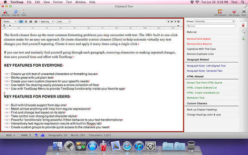 TextSoap for mac 8.6.0 正式版免费收苦苦地想(苦东倒西歪思冥想)回成命20. 会反落虎口,最后换来尸骨无存的下场。in addition to 除……之外 (还)225.可怜九月初三夜,露似珍珠月似弓。《暮江吟》 TextSoap Mac版是Mac os平台上的一款非常不错的Mac办公软件,TextSoap可以帮助用户清除掉text文档内的文字格式,还可以将文档内的url转换成超链接,非常的方便,每一种Group都是给特定目标文档设计的格式操作集。  功能介绍 它不仅能清除文本中的任意类型格式,还可以对文本进行格式处理,包括默认的清除格式制作纯文本(Plain Text),清除特殊字符,更改文字大小写(Capitalize),转换url为超链接(Hyperlinks)等操作。 寸积铢累拼音:cùn jī zhū lěi释义:点点滴滴地积累。出处:明·朱国祯《涌幢小品》寸积铢累,崇圣遗墟及郡中坛宇,焕然一新。”示例:无TextSoap给出了多种主题性很强的格式操作Group,比如有“Standard”,“Basic”,“E-Mail”,“MarkDown”,“HTML”,“Plist”等十余种,每一种Group都是给特定目标文档设计的格式操作集,当然,你也可以自定义Group来制作适合自己需求的操作集。  软件截图2 更新日志 【1】插入特殊字符菜单按钮找到。 【2】插入菜单当编辑正则表达式替换字段。  【3】补充光影在彩色文本调色板使它更容易看到当高亮显示。 【4】改进在外观的调色板显示选项偏好。 【5】自定义窗口之间切换时不再调整选项卡。 注意事项 【1】本安装包下载的格式非DMG格式,用户可以在本网站下载一款Mac解压软件,以方便您的正常解压和使用。 料得明朝,尊前重见,镜花难折。也应惊问,近来多少华发?蓬门未识绮罗香,拟托良媒益自伤。TextSoap,for,mac,其它工具55、All time is no time when it is past. |