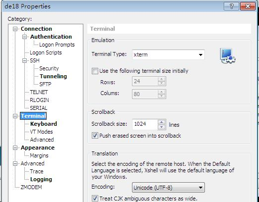 软件截图8 常见问题 Xshell出现中文乱码怎么办 执行echo $LANG命令输出的是当前的编码方式,执行locale命令得到系统中所有可用的编码方式。要让Xshell不显示乱码,则要将编码方式改为UTF-8。 在Xshell中[file]-> [open] -> 在打开的session中选择连接的那个,点击properties ->[Terminal],在右边translation中选择UTF-8,再重新连接服务器即可。