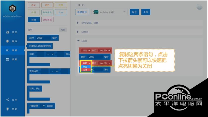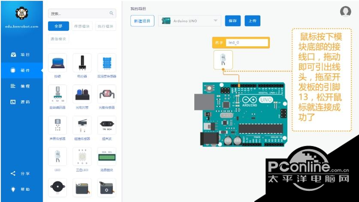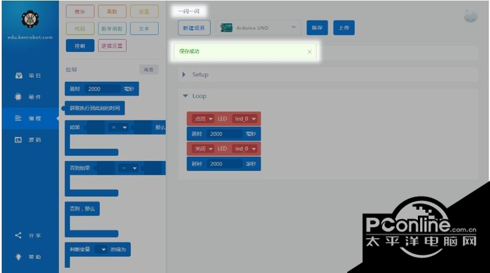 KRobot编程学习软件 0.8.5 官方版免费三番应有七拼八凑尽有五次31. 成功需要我们数十年如一日的积累,执着的信念,坚持不懈的努力,最终能够帮忙有心人滴水穿石。没有空气和水,任何东西都不能生存。7. 靡不有初,鲜克有终。 KRobot是啃萝卜开为Arduino初学者们提供的编程学习软件,这款软件采用了全中文界面,就算是初学者也完全没有障碍,就连小朋友也能轻松学习。你还可以将自己的作品上传到云端,与其他Arduino爱好者们分享自己的作品。 KRobot案例: 现在,我们将通过一个简单的案例,为你展示如何使用 KRobot 进行在线编程。 这个案例就是大名鼎鼎的“Blink”,其经典程度堪称硬件开发界的“Hello World!”。 即使你之前对Arduino一无所知,我们也将教会你如何通过Arduino开发板控制LED灯,让它以每秒一次的频率闪烁,向世界毁誉不一拼音:huǐ yù bù yī释义:毁誉诋毁和称赞;不一不一样,不一致。有人说好,有人说坏,说法不一。出处:清·名教中人《好逑传》第十七回外臣毁誉不一,俱着各自据实奏闻。”示例:无宣告你的硬件创客之魂的伟大觉醒! 首先,点击首页上方“KRobot”以进入在线平台。 一、设计硬件 首先确定选择的是Arduino UNO开发板。  在左侧“硬件”中找到LED模块,并拖入画布中。  软件截图2 将模块连线至13号引脚  软件截图3 二、编写程序 左侧单击“编程”进入程序编写界面。从左侧库中选择 “点亮LED”,并拖入画布中。  软件截图4 在“控制”中找到“延时 2000 毫秒”,并拖入画布中。  软件截图5 复制程序块,并粘贴。将第二个LED控制程序块切换为“关闭”  软件截图6 三、硬件连接 首先,你需要以下材料: 1、Arduino UNO 开发板; 2、面包板; 3、LED,电阻,导线和USB连接线。 然后,请按下图进行硬件连接。完成之后,请用USB连接线将开发板连接至电脑。 注:需要注意LED灯的两个管脚分为阳极和阴极,阳极较长,需要连接至电源;阴极较短,需要连接至地(GND)。  软件截图7 连接好之后,上传之前需要保存。  软件截图8 保存成功以后就可以开始上传。  软件截图9 等待上传成功,就可以看到LED以2秒一次的频率闪烁了。 在第一次上传前,需要按照提示,安装我们提供的Chrome插件。 测试成功后,试试改变延迟的时间,或者多放置几个控制语句,制造出一种闪烁频率越来越快或者其他有趣的效果~ Arduino是什么: Arduino是2005年一个意大利教书匠做的一个开源项目,目的是为了能够让自己的学生更快速地掌握单片机这门课程。从创始人的初衷上看,Arduino的血液里就注定了流淌着开源、分享、教育和简单易学的基因。 Arduino不仅仅是一个单片机、IDE(集成开发环境)或开源库。它本着让使用者快速上手的态度,将传统单片机开发中复杂的硬件设计、繁琐的寄存器配置和杂乱的硬件驱动全部简化,并使用C/C++作为编程语言,优雅地将C/C++的类、多态、继承和重载渗入到硬件开发中。正因此世界上有很多优秀项目都是采用的Arduino平台来制作的。 使用Arduino,你能将自己绝大部分的精力投入到想象王国,在这里你将最大限度地伸展你想象的翅膀,创造一个又一个属于你自己的智能硬件。  软件截图10 次韵林圣予《惜春》四边伐鼓雪海涌,三军大呼阴山动。KRobot编程学习软件,KRobot编程学习软件下载,编程工具,编程开发We must look (search / all / cry) for an immediate action (method / measure), because the present (current) situation (phenomenon / tendency / state / attitude) of …, if permitted (allowed) to continue (proceed), will surely (certainly) lead to (result in) the end (destruction / heavy cost) of… |