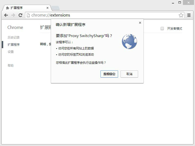 4. 确认新增扩展程序,选择“我相信它”。到此 SwitchySharp 安装完成。