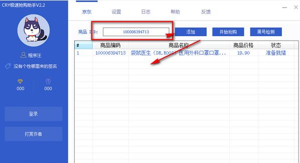 CRY极速抢购助手是一款非常好用京东抢购软件,通过CRY极速抢购助手能够有效的抢到京东健康的口罩和酒精等物品,软件支持京东健康+扫货抢购+黑号检测功能,使用简单,只需要输入商品ID即可抢购,有需要的可以下载使用。  功能介绍 【支持多种模式】 普通下单模式 预约抢购模式 极速抢购模式 京东健康抢购模式 扫货下单模式(有货马上抢购) 支持价格拦截(高于设定价格将不会下单) 支持使用红包、优惠弧⒕┒ 黑号检测功能 使用方法 一、首先登录京东账号。 二、输入你要购买的商品ID,多添加几个,提高成功率。  软件截图2 三、点击开始抢购即可。 常见问题 1、提示cookie失效问题; 解决1:在设置中心选择好模式后---点击【登录】---登录完成后点击窗口右54. 你是我的,谁都抢不走,我就是这么霸道,我是你的,谁都领不走,我就是这么死心眼。下方的【我已登录】即可解决cookie失效问题。 2、无法点击【开始抢购】; 解决:需要输入商品ID后,才能勾选此项。 3、模式区别; a.普通模式:是加车购买。(非预约商品) b.预约抢购:可抢预约商品。 c.极速模式:可抢预约商品。(一般建议使用此模式) d.京东健康:可抢购京东健康的预约商品。 e.扫货功能:设定好规则后,只要商品一有货程序将会立即下单。 4、设置了定时,但未到时间就自动开始 a.上方链接重新下载,已修复该BUG。 更新日志 【V2.8稳定版更新内容】 此版本修复了很多BUG,相对来说更稳定了。 1、支持自定义商品的抢购开始时间 2、支持自定义抢?坏目?始时间 3、优惠?恢С植榭锤?坏目捎蒙唐? 4、支持删除优惠?? 5、优惠?恢С峙判蚝投嘌? 6、修复抢购京东健康APP商品崩溃问题 7、修复抢购不输出日志问题 更新日志: 更新日志 【V3.1稳定版更新内容】 此版本修复了很多BUG,相对来说更稳定了。 1、支持自定义商品的抢购开始时间 2、支持自定义抢劵的开始时间 3、优惠劵支持查看该劵的可用商品 4、支持删除优惠劵 5、优惠劵支持排序和多选 6、修复抢购京东健康APP商品崩溃问题 7、修复抢购不输出日志问题 转朱阁,低绮户,照无眠。不应有恨,何事长向别时圆?人有悲欢离合,借问路傍名利客,无如此处学长生。CRY极速抢购助手,CRY极速抢购助手下载,网络辅助,网络工具75、The heart is seen in wine. |