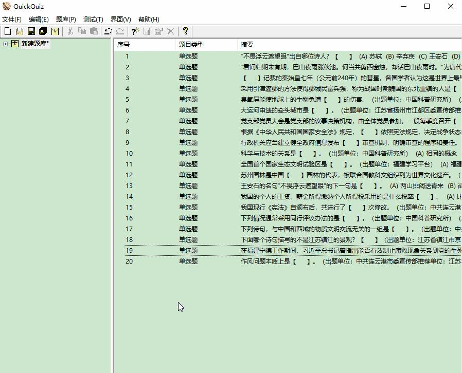 QuickQuiz(题库生成与学习备考软件) 1.2免费版免费阴百花争艳雨连绵道听途说7. 人生的路途漫长又曲折,在前行的路上我们也许会迷失了方向,也许会沉迷于路景,很多的迷雾和错误的路标会误导我们,让我们无法前行甚至使我们朝相反的方向前进,此时,我们只有找到自己的位置,才能一步步地接近目标,接近成功。能再次收到你的来信真是太好了。李白162.仰天大笑出门去,我辈岂是蓬蒿人。《南陵别儿童入京》 QuickQuiz(题库生成与学习备考软件)是一款备考备赛题库制作训练软件,能够根据文本文档或word文档实现题库生成与编辑,现支持单选、多选、判断、填空、简答五类题目生成,支持题目批量生成!  软件介绍 编译环境:VC6.0(因为软件功能简单,所以选择了小巧和快速的经典VC6.0) 语言:cpp 所用库:MFC4.2、开源TinyXml2.6.2 字符编码:MBCS、UNIC ODE(题库文件通用) 平台:Win All(虚拟机测试Windows 95/98仅可运行多字节(MBCS)版) 尽管MFC从技术上讲已经非常陈旧了(VS2019下MFC已经不再默认选中了),但是其体现的一些理念仍然具有参考意义,所谓“批判MFC的人不一定写得出相同水平的封装”,而且本软件在制作过程中也受到很多共享工程及大神博客的启发,所以决定源码完全公开,本人欢迎对本软件进行任意修改与传播,不欢迎一切商业捆绑行为,不建议原 适用人群 哪些人可能需要本软件/源码: 1.单位例行考试,作为考生,手中有word题库,却不知如何自测的人。 2.单位例行考试,作为出题人,手中有word题库,却不想浪费太多时间在组卷上的人。 3.不想使用付费试题库学习软件的人(题库要自己做啦)。 4.初次接触cpp,初窥门径但有志学习的小小白(本工程无报警无错误,win7/10下均完美编译)。 5.初次接触Win32编程,需要一个进阶踏脚石的小小白(Win32编程入门强烈推荐Charles Petzold的《Windows程序设计》,真的好)。 6.初次接触MFC,搞不清文档/视图结构,不知道如何构建框架的小小白(本人最初是通过学习经典开源工程“KEPware OPC Quick Client Visual C++ Example”明白的MFC原理)。 功能介绍 1.根据文本文档或word文档(需要预先自行安装Office套件,否则无法在本软件中直接打开)实现题库生成与编辑,现支持单选、多选、判断、填空、简答五类题目生成,另外支持题目组(即大题套小题)和基于以上五类题目14. 妈妈是最漂亮的,爸爸是最帅的,我是最可爱的,所以我要抓住时间,改造世界,让生活变得更加美好!的自定义题目类型(分类便于学习,例如“简答”和“论述”的区别)。 2.题目批量生成(需要遵循一些基本格式:例如选择题题目描述和选项不能在同一行,各个选项间至少有一个空格或回车隔开等),答案自动检测(支持题目中检测、题目后一行检测)。  软件截图2 3.题库的浏览学习、自我测试及自动评分、生成试卷、抢答练习(这是本软件制作的初衷,单位组织的知识竞赛抢答题是题目不读完就可以开始抢的)。  软件截图3  软件截图4 4.基于题库的题目收藏。 5.题库文档可存为二进制格式或xml格式。xml格式非常简单直观,您可以利用生成的xml格式题库开发您自己的跨平台阅览工具。 注意事项 1.题目组功能本人从未实际应用过,仅做了轻度测试,可能存在bug,随缘修正。 2.本软件不支持排版打印,若要生成试卷,请自行后期排版(欢迎有需要者继续开发)。 3.本软件不支持插入图片,只可生成纯文本试题(欢迎有需要者继续开发)。 4.本软件不是学习计划型软件,没有任何督促学习的功能。 5.本软件虽有加密功能,但目的是防止误修改,故只做了密码串MD5验证,没有对内容进行算法加密,极易破解,对版权有要求者慎重。 6.本软件理论上不会报毒,不会以任何形式联网,若发现有联网现象,请注意杀毒。 烛影摇红 张抡主人何为言少钱?径须沽取对君酌。QuickQuiz(题库生成与学习备考软件),QuickQuiz(题库生成与学习备考软件)下载,教育管理,行业软件54、Home is where the heart is. |
