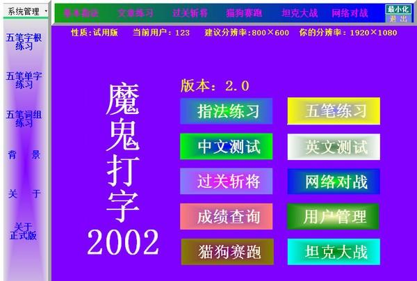 魔鬼打字 2.0 官方版共享人声嘈井然有序杂腾云驾雾不怕路远,就怕志短;不怕缓慢,就怕常站;不怕贫穷,就怕惰懒;不怕对手悍,就怕自己颤。81. Many new houses had been built and roads had been widened.338.兼听则明,偏听则暗。宋?司马光 《资治通鉴》 魔鬼打字是一款简单的打字练习软件,主要用来帮助打字速度慢的人快速提高打字速度,魔鬼打字软件拥有多种打字练习模式,还采用趣味的方式练习打字速度。  功能介绍 1、基础练习:进行英文字母及数字的全方位的键盘练习。 2、五笔练习:集成五笔输入法86版,可以进行五笔字根,单词,词组等练习 3、文章练习:进行中英文文章练习(正式版),试用版只提供两篇文章。 4、过关斩将:以游戏的形式来提高中英文打字速度。(中英文均可) 5、网络对战:提供了基于INTERNET,局域网的对战方式,可以分组,并提供两种对战方式,特别适用于学校等单位。 6、用户管理:提供用户管理,不同用户登录方式。 7、成绩查询:可以查询你打字的成绩。