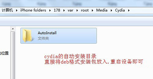 4. 对于安装deb包来说也很方便,你只需要找到cydia的aotoinstall目录直接建立快捷方式。将deb格式文件拷贝到该目录下,然后重启设备就可以安装了。