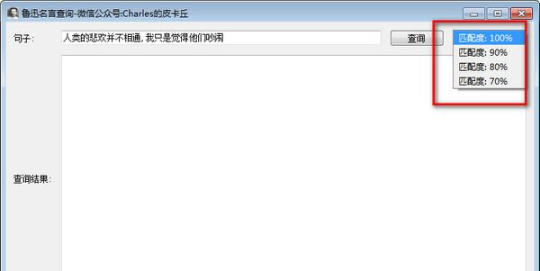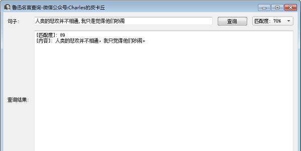 鲁迅名言查询 0.1.0 免费版免费喧腾群侃侃而谈星灿烂飞溅47. 时间匆匆,总不会为任何事物停下脚步。蓦然回首,那日子就像在雪地里留下的脚印,有的深,有的浅……13. 就我而言/ 就个人而言 As far as I am concerned, / Personally,181.丹青不知老将至,富贵于我如浮云。《丹青引赠曹将军霸》 鲁迅名言查询系统是网友根据前一阵大火的鲁迅博物馆名言查询系统制作的个人版软件,利用软件用户就能够在电脑上查询鲁迅的名人名言并且找到其出处,方便用户学习写作,软件支持模糊查询,有需要的可以下载使41. 分手后不要回头,就算那段感情再甜蜜它也只是一个曾经。用。  功能介绍 可以根据某一句话查询到鲁迅先生的原话。 使用方法 一、下载打开软件,输入你印象中鲁迅的某句名言,点击查询。  软件截图2 二、如果查询不到,试着调整一下匹配度  软件截图3 三、调整完成后点击查询,即可搜索到原话。  软件截图4 天涯倦客,山中归路,望断故园心眼。燕子楼空,佳人何在?空锁楼中燕。寂寂江山摇落处,怜君何事到天涯!鲁迅名言查询,鲁迅名言查询下载,文科工具,教育软件8、Faith can move mountains. |