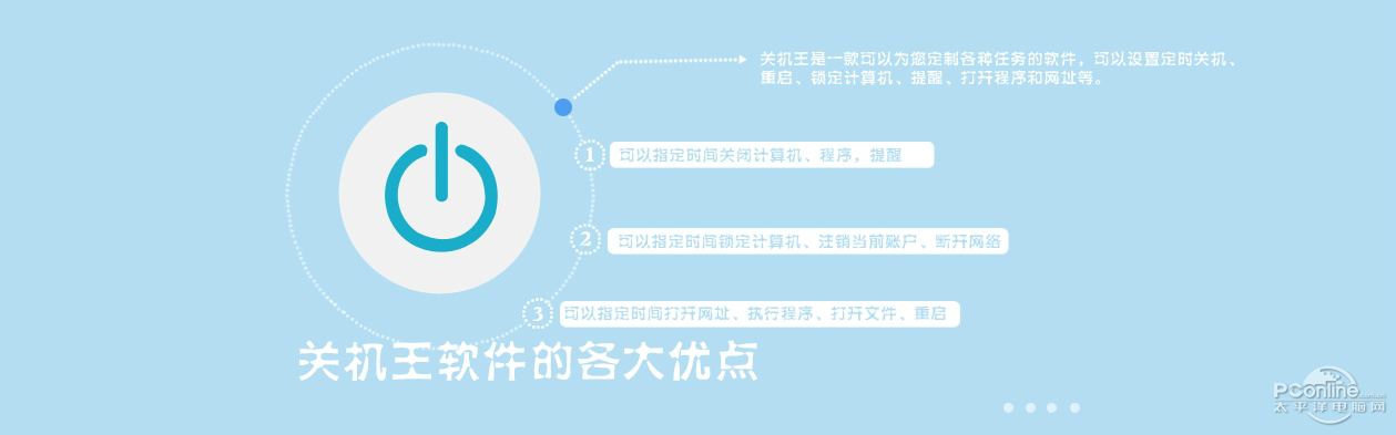 关机王自动定时关机软件 3.579 正式版免费汪洋大海发数不胜数奋图强28. 如果不爱你能够让你幸福,那么我就只是喜爱你。”75. Classes in our school usually finish at four in the afternoon.133.天苍苍,野茫茫,风吹草地见牛羊。《敕勒歌》 关机王自动定时关机软件是网络人开发的一款电脑自动关机、电脑定时关机软件,可设定多种定时关机方式,例如指定时间关机,鼠标无操作后自动关机、当前时间延后关机,还可以定时提醒信息,定时切断网络、执行程序、打开文件,禁用注册表、任务管理器、聊天软件,禁止打开指定软件和窗口,自动执行计划任务……关机王下载可用于管理电脑定时自动关机,节约用电。关机王下载还具有进程防护功能,可防止自身进程被恶意结束,所以关机王官网下载还可以用其规范员工操作电脑的行为,或对孩童使用电脑进行监管,限制儿童使用电脑的时间, 保护视力,防止浏览不良信息,沉溺电脑游戏。网络人还开发有远程开机卡,拨打电话或手机即可实现远程开机,然后再通过关机王软件自动关机,极大的提高您的办公效率。  关机王自动定时关机软件截图1 功能介绍: 1.可以设定具体时间,比如2012年3月15日23:59:59,让电脑自动执行关机等任务。 2.可以设置每天某个具体时间,比如每天23:00关闭计算机等任务。 3.可以设定几小时几分钟后,电脑自动执行关机等任务,比如1小时30分钟。 4.可以设定开机几小时几分钟后,电脑自动执行关机等任务,比如开机后2小时30分钟。 5.可以给上述的任务加个30秒倒计时提示。 6.同样可以设置软件自启动,对于某些程序、任务,可以设置计划任务在某段时间自动执行。  关机王自动定时关机软件截图2 软件特色: 对于大中小型企业计算机管理、服务器统一管理和家庭父母监管孩子上网等情况。如果单位里需要在下班后为忘记关电脑的同事关闭电脑,或是在工作中需要一些计划任务提醒等操作,关机王定时关机软件将是您理想的选择。  软件截图3 安装步骤: 具体的安装过程如下: 第一步:双击运行关机王自动定时关机软件安装程序,打开关机王自动定时关机软件装包。  软件截图4 第二步:点击【自定义安装】按钮选择安装目录  软件截图5 第三步:单击【安装】开始安装以后即可开始安装。  软件截图6 第四步:安装完成即可打开。