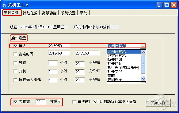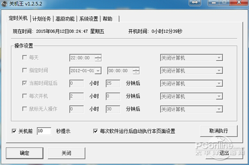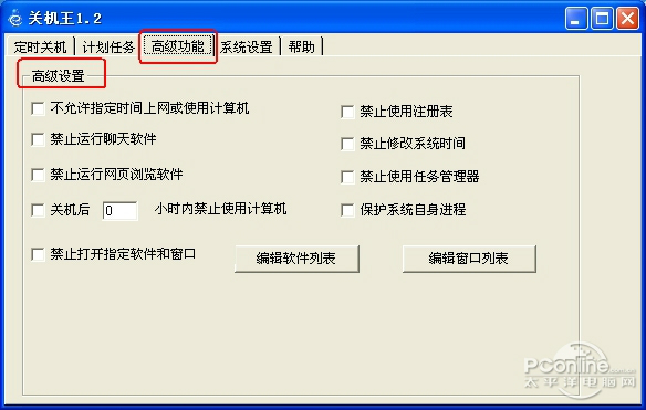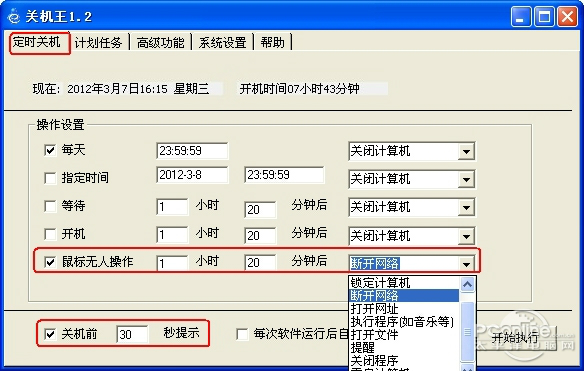 使用方法: 一、关机王软件怎么用? 关机王下载-定时关机功能 当天几点几分电脑自动关机。 等待多长时间后电脑自动关机。 远程控制电脑开机关机。 开机多长时间后电脑自动关机。 键盘、鼠标多长时间无操作自动关机关机。 可执行的任务有:关机、重启、锁定计算机、提醒、打开文件、打开网址、执行程序、关闭程序等。  软件截图7 二、关机王的计划任务功能怎么用? 如图添加你所要执行的软件即可,行提醒、打开文件(如:音乐)  软件截图8 执行程序,打开网址,关闭计算机,锁定计算机,断开网络 常见问答: 一、如何使用关机王定时关机软件设置电脑定时关机 软件安装运行之后,进入到“定时关机”页面—“操作设置”—“每天”—“23:59:59(假设关机时间)”—“关闭计算机”。注意,为了确保资料及时保存,建议设置“关机前”提醒信息。  软件截图9 二、如何在人突然离开的时候关机或者断网? 关机王下载安装运行之后,进入到“定时关机”页面—“操作设置”—“鼠标无人操作”—“1小时20分钟”—“断开网络”。也是同样注意,为了确保资料及时保存,建议设置“关机前”提醒信息。  软件截图10 三、关于关机王下载高级功能的解答与说明。 1 不允许指定时间上网或使用计算机:可以在家庭管理孩子方面,设置不允许指定的时间比如说中午13:00到14:30不允许上网或使用计算机,则在午休的时间保障孩子的睡眠。 2 禁止运行聊天软件:针对于企业管理,可以设置电脑运行聊天软件,有效提高工作效率;针对孩子上网监控,也可以设置此选项。 3 禁止运行网页浏览软件:可以禁止浏览一些不良网站,从小保障孩子的身心健康。现在我们很多的知识通过互联网获取,但同时互联网业存在很多的不良信息,如果吸取知识的方式不正当,比如浏览了一些不健康的暴力的网站,容易损害孩子的身心健康。公司管理上也可以设置此选项,避免员工在上班时间做其他闲散事情。 4 关机后某时间内禁止使用计算机:这个选项的设置既保证了电脑本身得到休息,也间接保障了我们的休息。 5 禁止打开指定软件和窗口:可以限制一些固定程序不被执行,尤其在企业管理上,禁止某些程序某个窗口的运行,可以很好的保障企业的资料等安全信息。 6 禁止使用注册表:主要是保护关机王定时关机软件的有效运行。 7 禁止修改系统时间:通过修改系统时间,可以让设置的定时关机命令不起作用;为了保证关机王定时关机软件的稳定运行,则设置此选项,以确保关机王软件设置的命令生效。 8 禁止使用任务管理器:保护程序运行,因为用户可以通过任务管理器结束掉进程,当然可以退出关机王定时关机软件。 9 保护系统自身进程:同样是保护关机王定时关机软件的稳定有效运行。  软件截图11 更新日志: 定时注销功能更新 小编通过下载使用发现这款关机王下载软件对于孩子使用电脑的管理有强制作用,对于企业来说也可以强制禁止运行聊天软件来提高员工工资效率,而且对于一些不良网站还可以禁止浏览,保障了孩子的身心健康,关机王绿色版这款软件对于家长和网络公司来说是一款不错的软件,喜欢的朋友赶紧行动了! 晓行310张泌:寄人关机王自动定时关机软件,开关定时30、Do not change horses in mid-stream. |