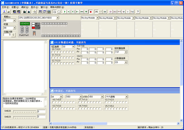 S7-200SIM是用来代替PLC硬件调试用户程序的仿真软件。S7-200 PLC仿真软件与STEP 7 编程软件一起,用于在计算机上模拟S7-200的功能,可以在开发阶段发现和排除错误,从而提高用户程序的质量和降低试车的费用。相比西班牙版本,该软件支持中断、函数、PID运算、指令叠加、顺序指令,并支持PPI、MODBUS,USS,以及自由口通信。  功能介绍 该软件还支持各种FLASH,VS编程的对象,从而更加方便进行真正的控制调试。如果要支持组态,则选择PPI协议,可能需要虚拟串口软件,例如VSPD6.9。所以该仿真软件不仅可以用于STEP7编程,还可以用于组态软件的测试。 软件支持对象的IO点自动分配,变量监控、设置,与强制。支持STL语言的运行状态监控。支持单步、慢速、第一步,N步执行等操作,可以看到所有的寄存区数据,并自持多种格式。支持变量状态表的导入。 软件中包括了15个A8000实训对象,以及控制程序。包括交通灯,彩灯控制,温度控制等。 夜合花 史达祖令彼征敛者,迫之如火煎。S7-200,PLC仿真软件,机械交通In 1999, it increased (rose / jumped / shot up) from 5 to 10 percent of the total (to 15 percent / by 15 percent). |