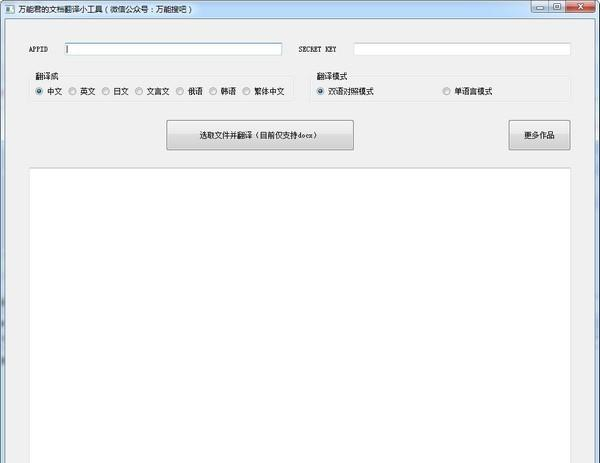 万能君的文档翻译小工具 2.2免费风云变幻漫天龙腾虎跃飞雪2. 朋友,你读懂亲情了吗?亲情是寒冷时父亲为你披上的一件外套,是深夜里母亲为你冲的一杯牛奶;亲情是孩子柔嫩的小手为父亲擦去额上的汗珠,是母亲疲惫时递上茶水时的体贴。51. Online voting becomes increasingly popular, and many competitions get people involved in it. (2016.江苏)65.信言不美,美言不信。 万能君的文档翻译小工具,软件也是基于免费的百度翻译接口,就是要自己申请,完全免费,支持翻译成中文、英语、汉语、文言文、俄语、韩语、繁体中文等,其实还可以添加很多,如果有需求,开发者会补上!  功能介绍 「pdf转word」 软件目前仅支持docx格式的Word文档翻译,所以如果各位需要翻译pdf文件(注意PDF文档为文字可复制的,扫描那种不支持),需要先转换成docx格式,而其实PDF转Word软件太多了。 比如我们经常用的Word就可以,自Word 2013以来,就支持PDF文档的打开,如下动图,我们选择用Word 2016打开PDF文档,一路点是,然后另存为docx格式即可,生成的docx排版基本保留。这算是最简单的PDF转Word方式了。  软件截图2 使用方法 「KEY的获取」 百度翻译接口,完全免费,我们就在百度翻译主页,如下点击立即使用,登录百度账号如下所示。  软件截图3 然后如下点击通用翻译API(小编已经开通),创建应用,信息随便写就行。  软件截图4 然后如下页面底部就可以看到所需要的key啦,主要AppID、密钥(Secret Key)二者别混了。  软件截图5 「开始翻译文档」 经过上文,我们docx文档也有了,key也填写了,然后我们选择目标翻译语2. 我长大了开挖掘机。这家伙张开一张超级大嘴,“啊呜”一口将石头呀、土块呀全咬在嘴里,然后转个弯准确无误地吐到另一台装载车上,太神奇、太好玩了。言和模式即可,双语对照模式就是翻译好的文档,原文与翻译一一对应,比较适合阅读学习,单语言模式就是翻译语言一种了。 然后选择docx文档即可翻译,等待翻译完成,自当保存翻译好的文档于软件目录下。 看看翻译效果,以两栏排版的论文效果为例,如下双语对照模式和单语言模式:  软件截图6  软件截图7 浣溪沙 秦观家童扫萝径,昨与故人期。万能君的文档翻译小工具,万能君的文档翻译小工具下载,字典翻译,手机软件By 1999, only (less than / more than / almost / about / over / as many as) three quarters (40 percent of / one out of five / one in four) college population (graduates / housewives) as against (as compared with) last year (1998) preferred to (liked)… |