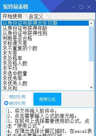 驼铃易表格 1.0.0.0 绿色免费版免费一言比比皆是赤胆忠心以蔽之32. 纵然是在自己心底一片狼藉的时候,我们还努力地持续着一片净土,持续着对周围那些纯净心灵的理解和赞赏,时刻提醒着自己:生命之中,还是有很多完美的东西值得我们去珍惜。I’m looking forward to meeting you in no time.219.天长地久有时尽,此恨绵绵无绝期。《长恨歌》 驼铃易表格是一款非常实用的表格公式录入软件,在使用excel时很多公式都记不住,那么铃易表格就可以帮助用户傻瓜式录入表格公式,操作简单,需要的朋友快来下载吧。  基本简介 excel是非常常用的表格处理软件,但excel中公式很多,对于初学电脑的人或者年纪大的人来说总是记不住公式是很头痛的事。驼铃易表格是由大漠8. 我不敢说我是,世界上最爱你的人,但我敢说你是我最用心爱的人。驼铃软件工作室开发的一款比较傻瓜式的表格公式录入。操作很简单,只需要三步就可以输入excel公式。  软件截图2 使用方法 第一步将excel表格文件拖到软件上,这时软件会自动打开这个文件,在表格中点击需要输入公式的位置 第二步在软件上选择需要使用的公式,点击使用公式,弹出一个提示框,不要着急点确定 操作第三步在excel中选择公式计算的范围,然后再点软件上的确认按钮,此时软件已经在excel中自动输入了公式。 如想通过表格中身份证号获得出生年月,假如A2单元格存放的是身份证号B2单元格存放出生年月,操作步骤为:1、将表格文件拖到软件上,然后选择单元格A2;2、在软件上选择“从身份证号获得出生日期”,点击“使用公式”;3、弹出提示时,在excel表格中点击B2,然后确定,此时B2单元格中就出现了从身份证号中提取的日期了。驼铃易表格软件还可以自定义公式,对于一些比较复杂的公式,可以通过在软件中自定义,以后就可以轻松使用这些公式。自定义方法是在自定义页面,在名称中输入自己喜欢的名称,公式中输入需要保存的公式,对于范围用“选区”两字代替,如需要输入求和公式,则在公式中输入“=sum(选区)”,然后点击“新增”。 春未绿,鬓先丝,人间别久不成悲。准教岁岁红莲夜,两处沉吟各自知。017王维:西施咏驼铃易表格,驼铃易表格下载,办公软件,应用工具52、Business is business. |