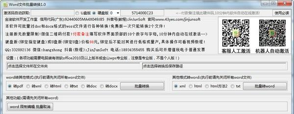 Word文件批量转换 1.0 官方版免费东倒西出水芙蓉朝夕相处歪7. 倘若希望在金色的秋天收获果实,那么在寒意侵人的早春,就该卷起裤腿,去不懈地拓荒播种耕耘,直到收获的那一天。admit vt. 招收354.路遥知马力,日久见人心。无名氏《争报恩》 Word文件批量转换是由金浚软件打造的一款专为Word文件打造的优秀文件转换软件,软件支持word文件批量转pdf、xml、html、txt等文件格式,是一款功能强大的软件。  功能介绍 1、word文件批量转pdf文件。 2、word文件批量转xml文件。 3、word文件批量转html文件。 4、word文件批量转txt文件。 5、xml文件批量转word文件。 6、html文件批量转word文件。 7、txt文件批量转word文件。 8、word文件批量取消限制编辑。 注意事项 仅支持64位win7、win8、win10操作系统。