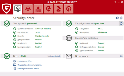 G DATA互联网安全套装官方中文版是一款功能齐全的网络安全软件,通过G DATA互联网安全套装能够轻松的进行反垃圾邮箱、网页病毒防护和家长控制等功能,您可以完全放心的使用G DATA安全套装保护您的数据安全,保证您轻松上网。带有强大的防火墙功能的这款产品给您电脑全面的保护。