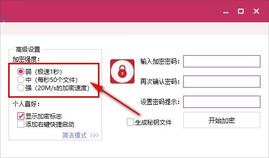 2、这里是三种加密方式选择,一般轻松下选择中等就可以了,如果是比较简单的文件,可以设置“弱”