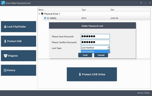 单击“锁定文件/文件夹”,然后单击“打开进行锁定”按钮以选择要加密的文件、文件夹或驱动器。之后,您可以输入密码并选择锁类型:不隐藏的锁或隐藏的锁。然后单击“锁定”按钮。如果要解锁文件,请先选择该文件,然后单击“解锁”按钮继续。