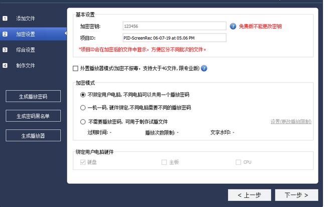 7、支持绑定功能,将自己的项目绑定电脑,一台电脑仅仅可以输入一个播放密码