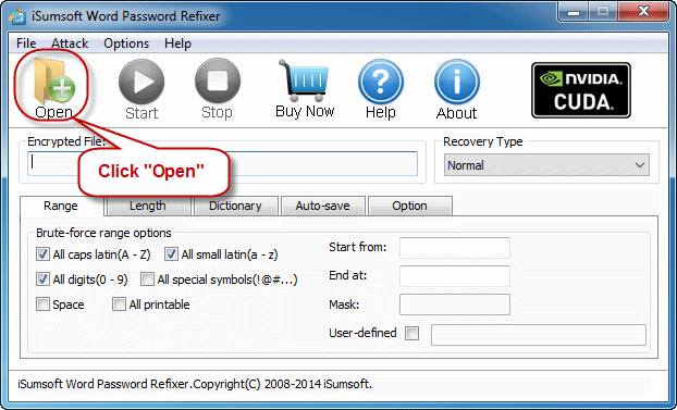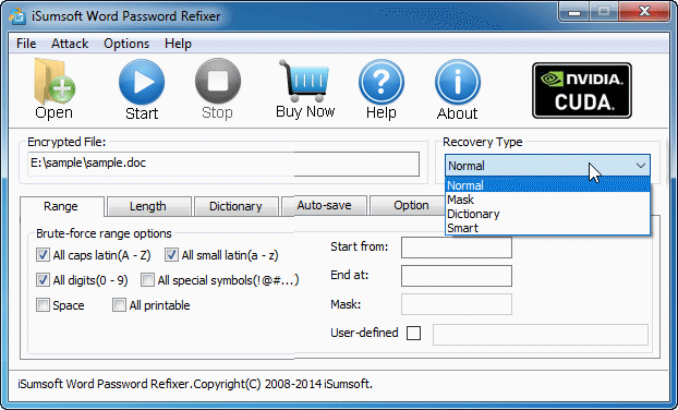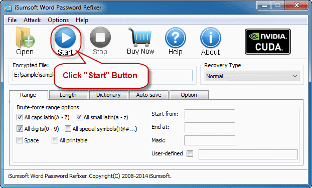 正常:此类型将尝试所有可能的密码组合以恢复丢失的Word密码。最好是你对丢失/忘记的密码一无所知。如果您使用这种类型,只需单击“开始”按钮。