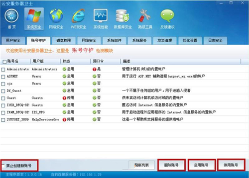 云安服务器卫士官方版是一款功能强大的服务器安全软件,能够保护用户帐号网络安全,防止主机、网络、网站等受到入侵,云安服务器卫士官方版还能给windows加上一层登陆锁,给操作系统层层加固让病毒木马无从入侵。能检测到服务器中存在哪些账号,以及其所属组和所处的状态。