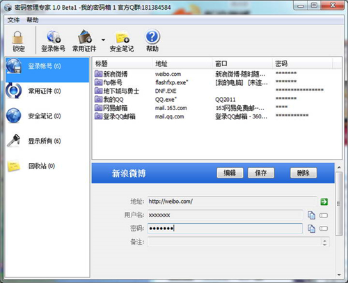 只需您记住一个主密码就可轻松管理您的各类帐号密码,如:银行、论坛、团购、邮箱、微博等的账号/密码/网址