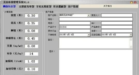 无纺布袋管理系统 1.0 官方版免费心惊沧豁达大度海一粟肉跳36. 所有美丽的东西似乎总是沉重的——但我们的痛苦便是我们的意义,我们的负荷便是我们的价值。诗诗,世上怎能有无重量的鲜花?人间怎能有廉价的美丽?我们学校通常下午四点下课。392.横眉冷对千夫指,俯首甘为孺子牛。《自嘲》 无纺布袋管理系统是一款商业贸易类软件,能够让用户完美经营无纺布袋的生意,让你能够从原材料进货、制造、存货、售货等方面做到完美,有需要可以下载。  软件特色 准确 因为我们是把所用的布料全部展开,计算其面积。 迅速 只需输入相应的参数,点击一下就可以了。 方便 不管是老板还是员工,都可以算,不会出现一个品,几种报价。 人性化 根据产品的不同,可以自由改变上面参数,比事简单的款可以工价报低。 简化 本软件直接把常用的参数输入了默认的数值,用户可稍加修改即可。 系统化 本软件集计算价格、管理管理和生产单打印,更系统的管理我们的业务。 操作简单 不管是新增客户还是计算价格,以及下单都能短时间内掌握。 使用方法 先选择款式(一定要先41. 说分手的时候不好吵闹。毕竟两个在在一齐那么久,分了他也会难过,只是他比较明智,不想束缚你的或他的明天。好聚好散,以后,还是朋友。对哟,上面有图示,大家可以看) 袋宽--------------袋子的宽度,单位米 袋高--------------袋子的高度,单位米 侧墙--------------袋子的厚度,单位米 单位根带长--------袋子手带长度,指一根的长度,单位米 克重--------------布料厚度(每米的重量)单位千克,如80克就输入0.08千克 布价--------------布料的价格,单位元/千克,有的地方按平方米计算,大家可以转化一下,或把克重输入为1,布价就按上每平方的价格。 加损耗------------布料从切印到缝纫,全部过程有损耗,大家可以根据自己的实际情况修改。如损耗5%,输入1.05,3%就输入1.03.本厂一般以1-2%计算。 切印费-------------主要是指印刷费,一个袋子全部印下来的费用,可以包含制版费,我厂一般为单面单色一毛,量大可以减少。 缝制费-------------即给缝纫工的每个袋子的加工费,或者热合费用,如果大家算细的话,可以加上电费和线费,一般为2-3分的电费和线费。我厂给工人的加工费有0.22元每个袋子。 加毛利-------------就是我们想赚的钱了,当然量大优惠,量少加价,这个大家都知道,想加多少就加多少,如果按上面计算的话,基本上就是纯利润。 新增覆膜袋里面 片料单价-------------是指膜带无纺布制好的按平方的价格,80克无纺布默认为2元/平方,如果用其它克重可自行计算输入即可,如1.8元。 每平版费-------------即按印刷面积所出的版费(软件已自动加好出血)我这里是每平1000元,即每平方毫米一毛钱。可根据不同情况进行修改。 版数------------------即需要出几支版。 阑干倚尽犹慵去,几度黄昏雨。晚春盘马踏青苔,曾傍绿阴深驻。落花犹在,香屏空掩,人面知何处?千寻铁锁沈江底,一片降幡出石头。无纺布袋管理系统,无纺布袋管理系统下载,进销存管理,行业软件61、The worse luck now, the better another time. |