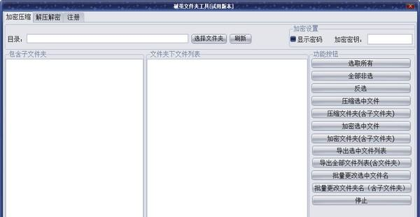 破茧文件夹工具 1.0.0.0 官方版免费果园飘香鹏杯弓蛇影程万里10. 男人的年龄是写在脸上的经历,是刻在心头的智慧,是深沉的魅力。而女人的年龄是隐藏在心头的刺,说不得碰不得,好像树的年轮,一圈一圈全藏在心里。I have made up my mind to complete the task.40.工欲善其事,必先利其器。 破茧文件夹工具是一个文件压缩加密处理软件,通过该软件,用户可以对文件进行压缩加密,保障文件的数据安全性,以免他人窃密,帮助用户保护文件安全,操作好使。  使用方法 1、压缩方法 压缩“文件夹下文件列表”中选中的文件 在目录栏粘贴好要压缩的文件目录或点右边“选择文件夹”按钮选择文件夹 在包含子文件夹里选择文件夹,文件夹的文件更新在“文件夹下文件列表”中 点右边按钮“压缩选中文件”, 选择保存文件目录,输入文件名点保存, 在程序底部出现进度条,当显示“列表文件压缩成功”表示压缩成功。 2、解压方法 切换到“解压解密”页面, 在目录栏粘贴好要压缩的文件目录或点右边“选择文件夹”按钮选择文件夹 压缩文件将全部解压到原压缩文件所在文件夹