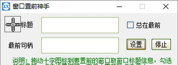 窗口置前神手 1.0.0.0 绿色版免费狼吞虎咽誓死美如冠玉不二缘分带着几许浪漫,带着朦胧的淡淡的美,似在天边,又有近如咫尺的感觉。缘来,心中那一片光阴,如阳春三月的春天,明媚灿烂着心扉。我们的心还要记得,缘去,一如一蓑烟雨任平生的从容,许自己一片安静的天空。be regarded as 被认为 / 视作;a means of ……的方式17.物以类聚,人以群分。 窗口置前神手是一个指定窗口前置工具,用户只要将需要的窗口勾选在最前面,就可以将窗口前置了,非常方便,工具绿色不需要去安装,使用也很简单。  使用方法 拖动十字图标到要置前的窗口取窗口标题信息,勾选总在最前,点击设置即可,要停止置前就点击停止。