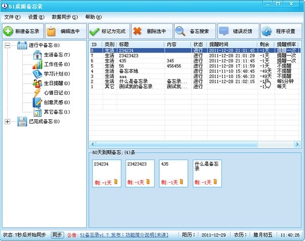 4、可按指定频率反复提醒:5分钟、半小时、1小时、1天、1年等,包您忘不了。支持农历提醒