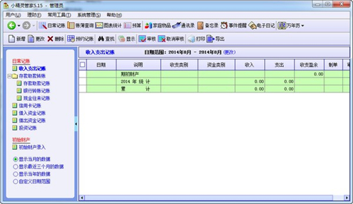 收入支出图:按月份统计收入支出数据,以柱状图表示,提供的表格有收支月表、收支分类表。