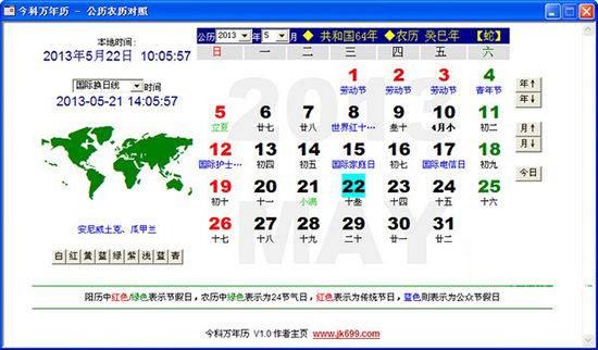 今科万年历是一款简洁实用的万年历,日期计算等均采用了现代高精度天文算法,公历农历对照,可以同时显示公历、农历、节气、国际节日、年月日干支、生肖等,可查询世界各地时间,是一款功能强大的软件。