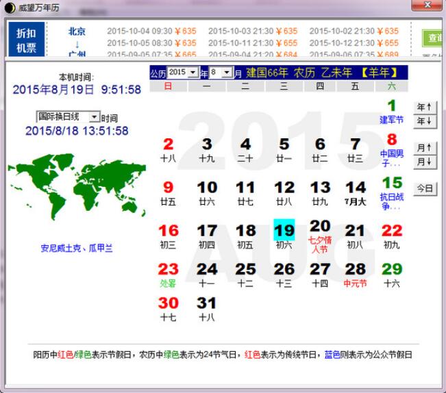 2.节日表示方法,阳历中红色/绿色表示节假日,农历中绿色表示为24节气日,红色表示为传统节日,蓝色则表示为公众节假日。