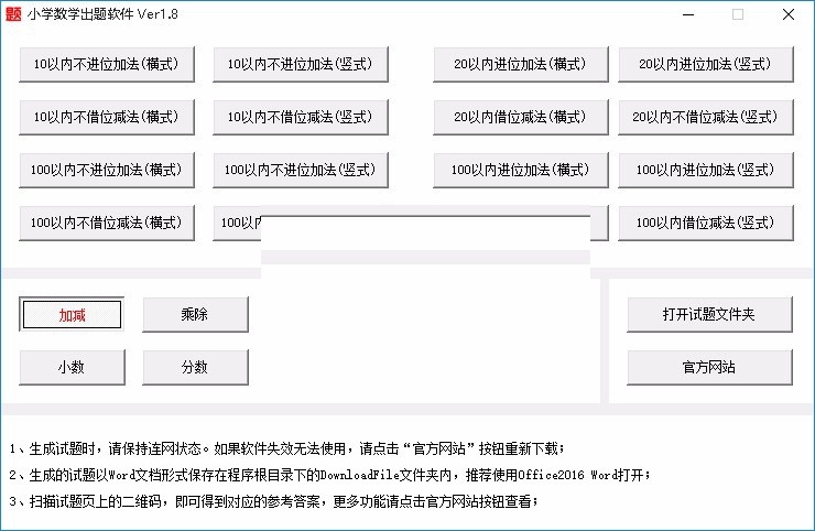 小学数学出题软件官方版支持对小学加减法进行一键出题,可生成100以内的加减法