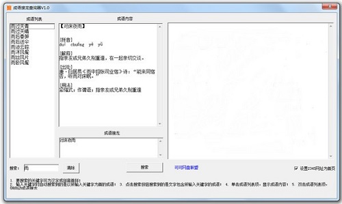 成语接龙查询器PC版是一款功能齐全、数据丰富的成语学习软件,支持首字母,和首字快速查询,查询后,还可以看到该成语的拼音,注释,内容等等。使用简单,体积小。成语接龙查询器可以对成语进行详细的分解从而达到成语接龙和成语查询的效果,非常适合玩成语接龙游戏时使用。