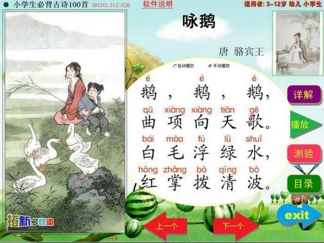 拓新少儿学古诗正式版是款实用性强,极易上手的古诗学习软件,拓新少儿学古诗正式版支持播放、测验等等功能,包含了多首常见的古诗词,每首诗都有作者介绍、名句欣赏、汉语拼音等内容,孩子理解的更加清楚以便于学习,并且每一首诗词都具有针对性,孩子学习起来会非常轻松。