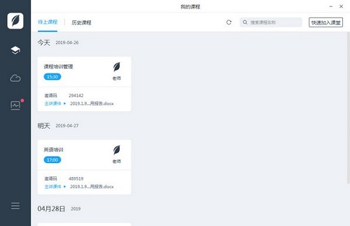 在主界面点选“我的课程”栏,主界面会显示所有“待上课程”(如图6),也可以通过界面上的“快速进入课堂”输入短码方式进行课堂。