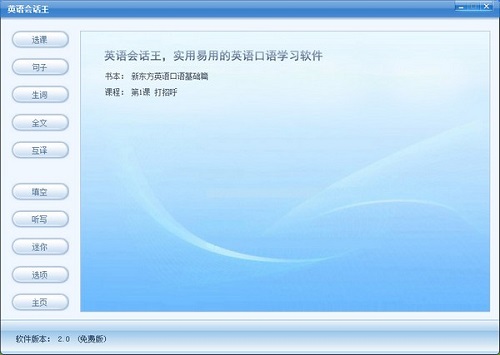 英语会话王官方版是一款功能全面的英语学习软件,英语会话王官方版支持选课、句子、生词、全文、互译、填空、听写等学习功能,在学习英语理论知识的基础上加深英语基础,提升英语表达能力。软件拥有迷你模式,可以让您在工作或娱乐之余不知不觉地学习英语。