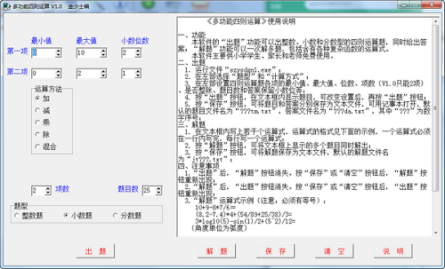 多功能四则运算官方版是一款小巧实用的四则运算题目出题工具,多功能四则运算官方版主要适用于小学学生、家长以及老师,可以免费使用,出题速度快,多功能四则运算的“出题”功能可以出整数、小数和分数型的四则运算题,同时给出答案;“解题”功能可以一次解多题,包括含有各种复杂函数的运算式。
