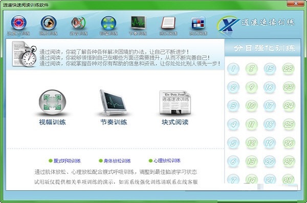 逍遥速读训练软件正式版是一款功能强劲实用的教育教学软件,逍遥速读训练软件正式版操作非常简单!可以用户大家提高阅读速度和理解能力,软件内置了28天训练计划,循序渐进的转换视读方式,软件还可以帮助用户提高阅读速度,加速理解效率。