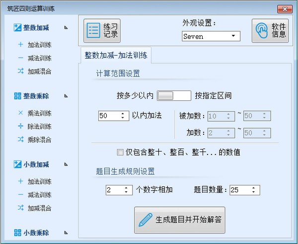 筑匠四则运算训练软件官方版包含有“整数加减”、“整数乘除”、“小数加减”和“小数乘除”四大块内容,其中子项分别有加、减、乘、除单项训练和混合训练,支持“连加”、“连减”、“余数”等等计算模式,计算锻炼类别丰富。