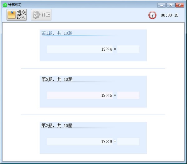 家长们可根据训练需要,设置出题方式。下面以乘法计算为例,设置被乘数出题范围10到20之间,乘数为1到10之间;题目数量为10道。如下图所示: