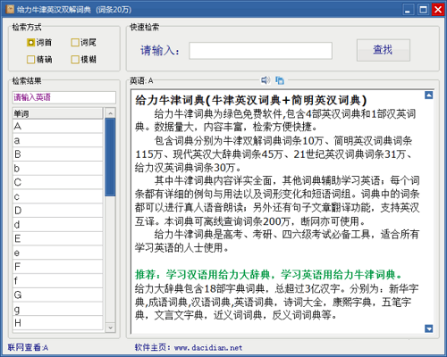 3、汉语词典收录词条41万多条。每个词条都有详细的拼音和解释;可按词首、词尾、词中、词义检索。