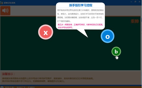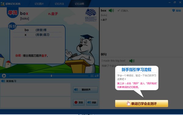 单词记忆王正式版是一款功能全面、轻巧便捷的英语学习软件。单词记忆王正式版操作十分简单!历时8年潜心研发,由59位英美单词记忆专家,151名中国优秀记忆及英语教师,通过20年单词记忆教学经验的总结,16名专业动画师和8名高级系统软件专家,共同打造的。《单词记忆王》全脑开发体系,左右脑并用记单词,图像1+1记忆,唤醒右脑潜能 ,10倍提高单词记忆速度,超级记忆系统缩短记忆时耗,提升记忆效率 !