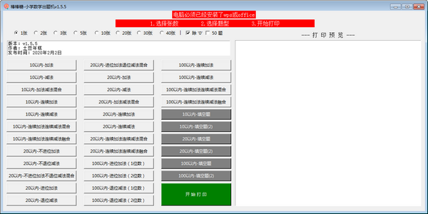为了化繁为简,此程序没有花里胡哨的选项,只要点一下你需要的题目按钮,就会立刻全自动打印出来,一键打印就是爽。